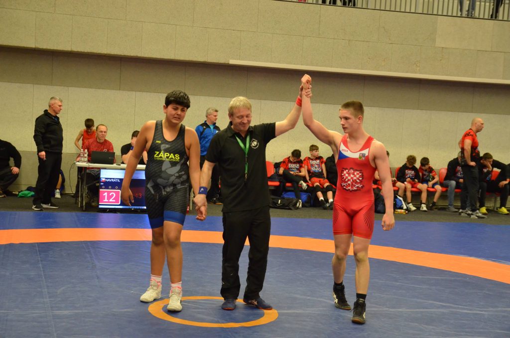 Stejně dominantní výkon předvedl i mladší žák Jan Navrátil, který ovládl váhu do 70 kg. V kategorii mladších žáků se zápasilo řecko-římsky, a v tomto stylu je Navrátil čerstvým mistrem republiky. Navrátilovo mistrovství bylo na žíněnce znát. Hodonínský sokol nejprve rozdrtil na technickou převahu Narega Sevaka Ipekdjana z rakouského klubu Hiro, a poté položil na lopatky Poláka Jakuba Kopku. Ve finále se Navrátil střetl s Markem Červeňákem z Meziboří, kterého rovněž vybodoval na technickou převahu.