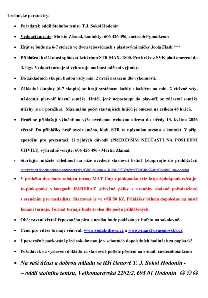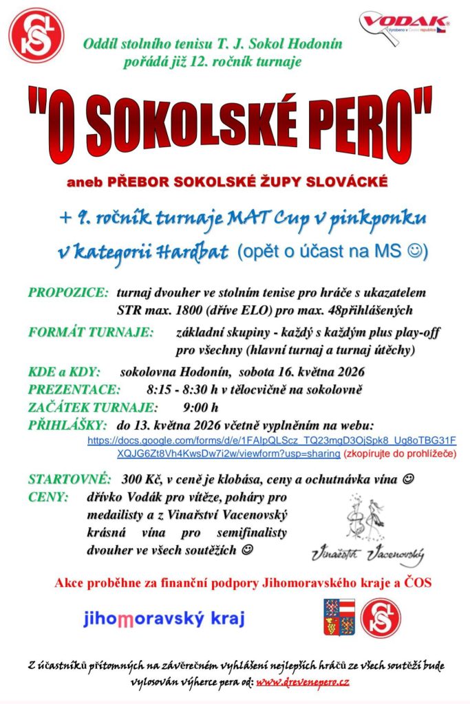 Dovoluji si vás tímto pozvat již na 12. ročník turnaje ve stolním tenise O sokolské pero konaném v naší hodonínské sokolovně dne 16. května 2026 a dále zvu na 9. ročník vloženého turnaje MAT Cup.